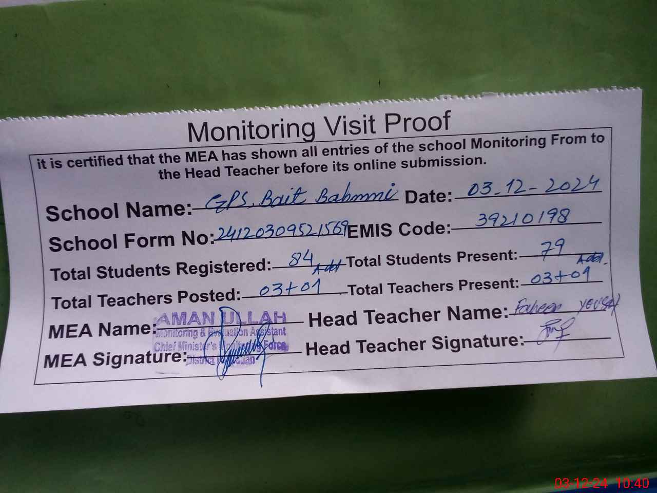 | Attendance Register | Head Teacher | MEA with School | Visit Proof |