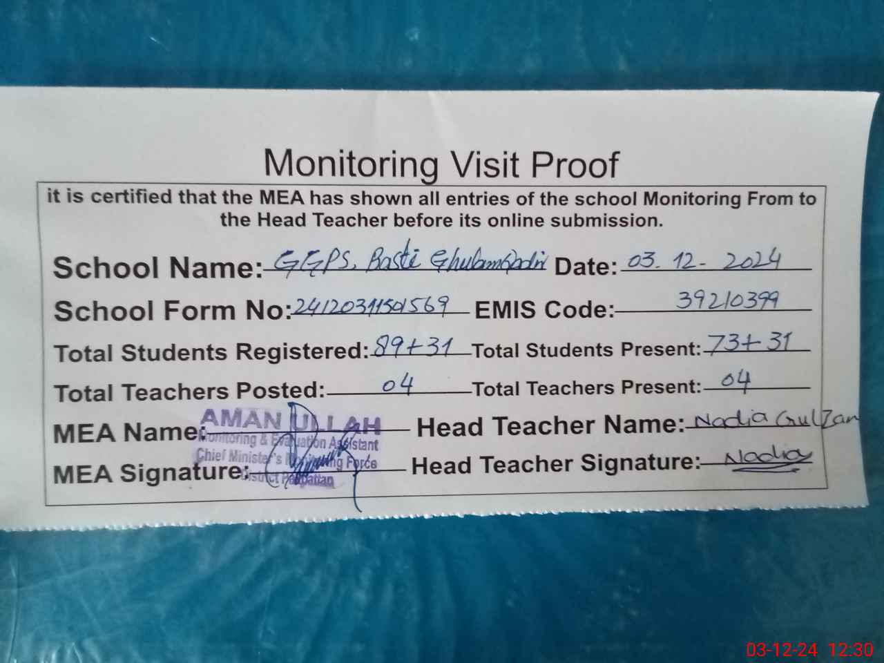 | EMIS Code: 39210399 | Name of School: GGPS BASTI GHULAM QADIR | |||