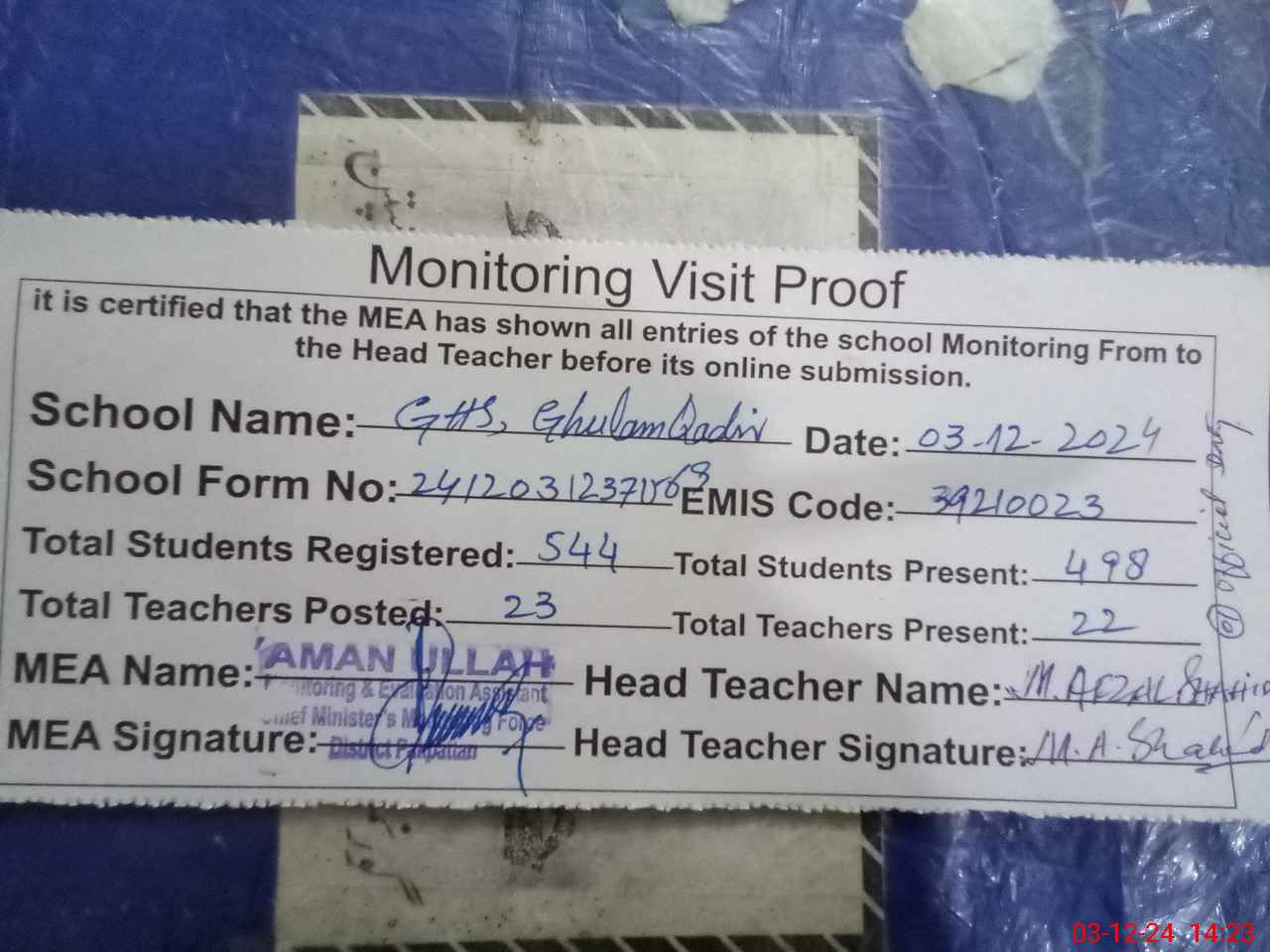 | EMIS Code: 39210023 | Name of School: GHS GHULAM QADIR | |||