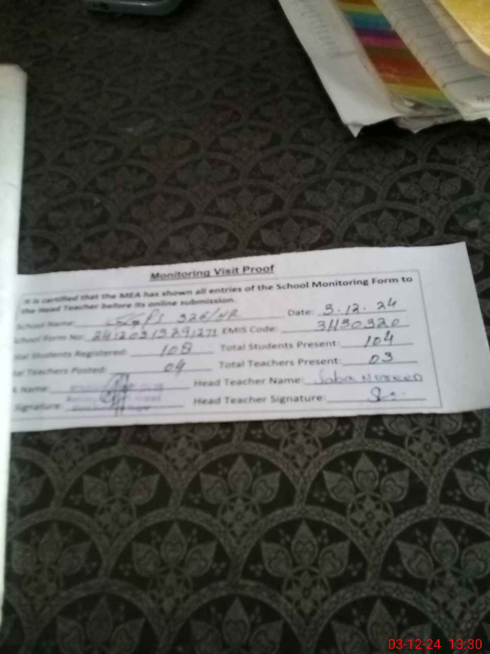 | Attendance Register | Head Teacher | MEA with School | Visit Proof |
