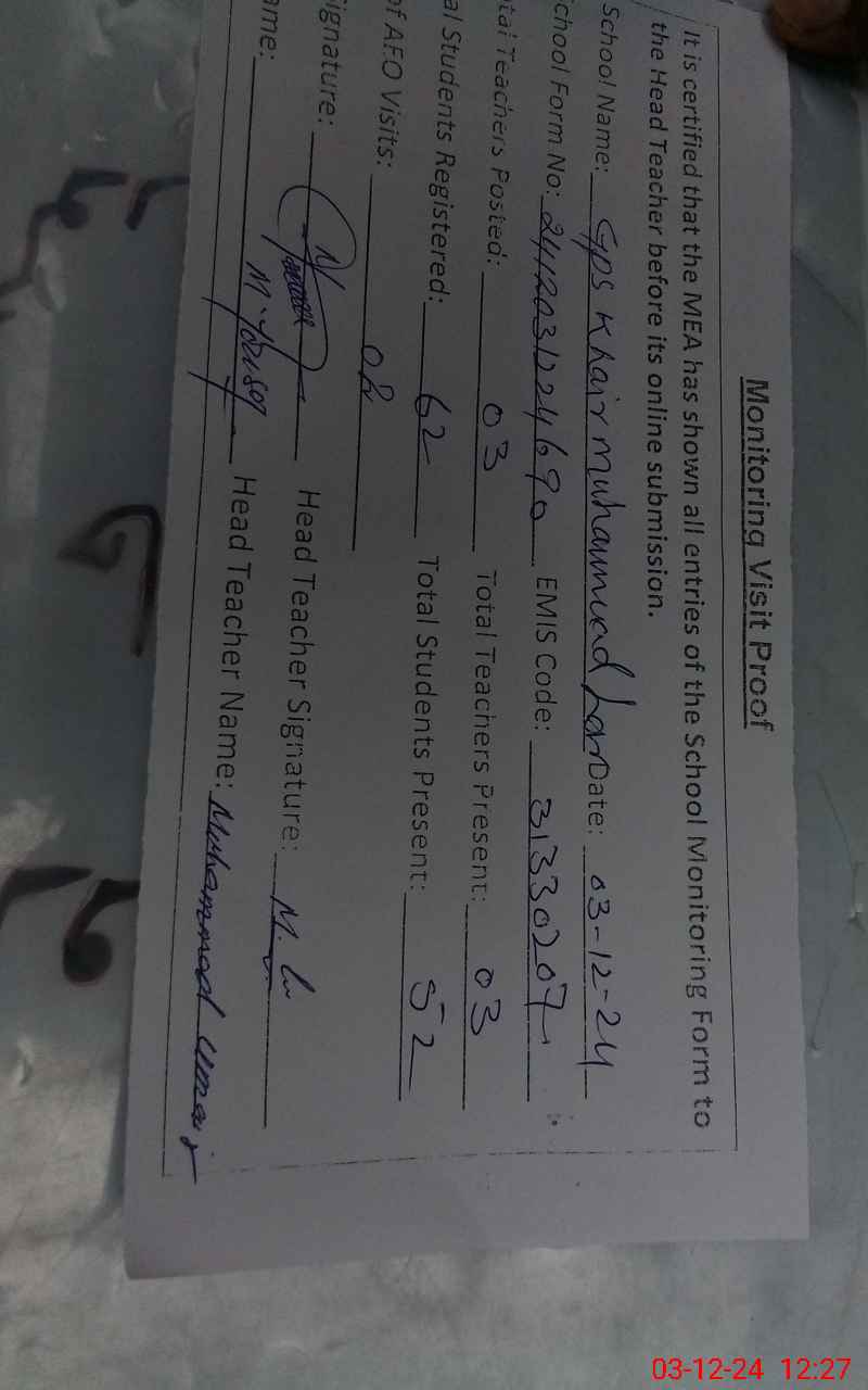 | EMIS Code: 31330207 | Name of School: GPS KHAIR MUHAMMAD LAR | |||