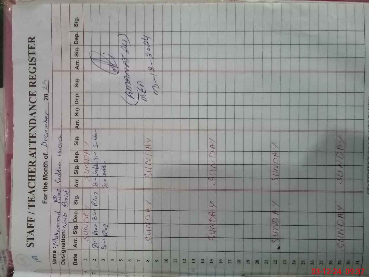 | CNIC | Full Name | Designation | R/C | Absence During Last Calender Month |