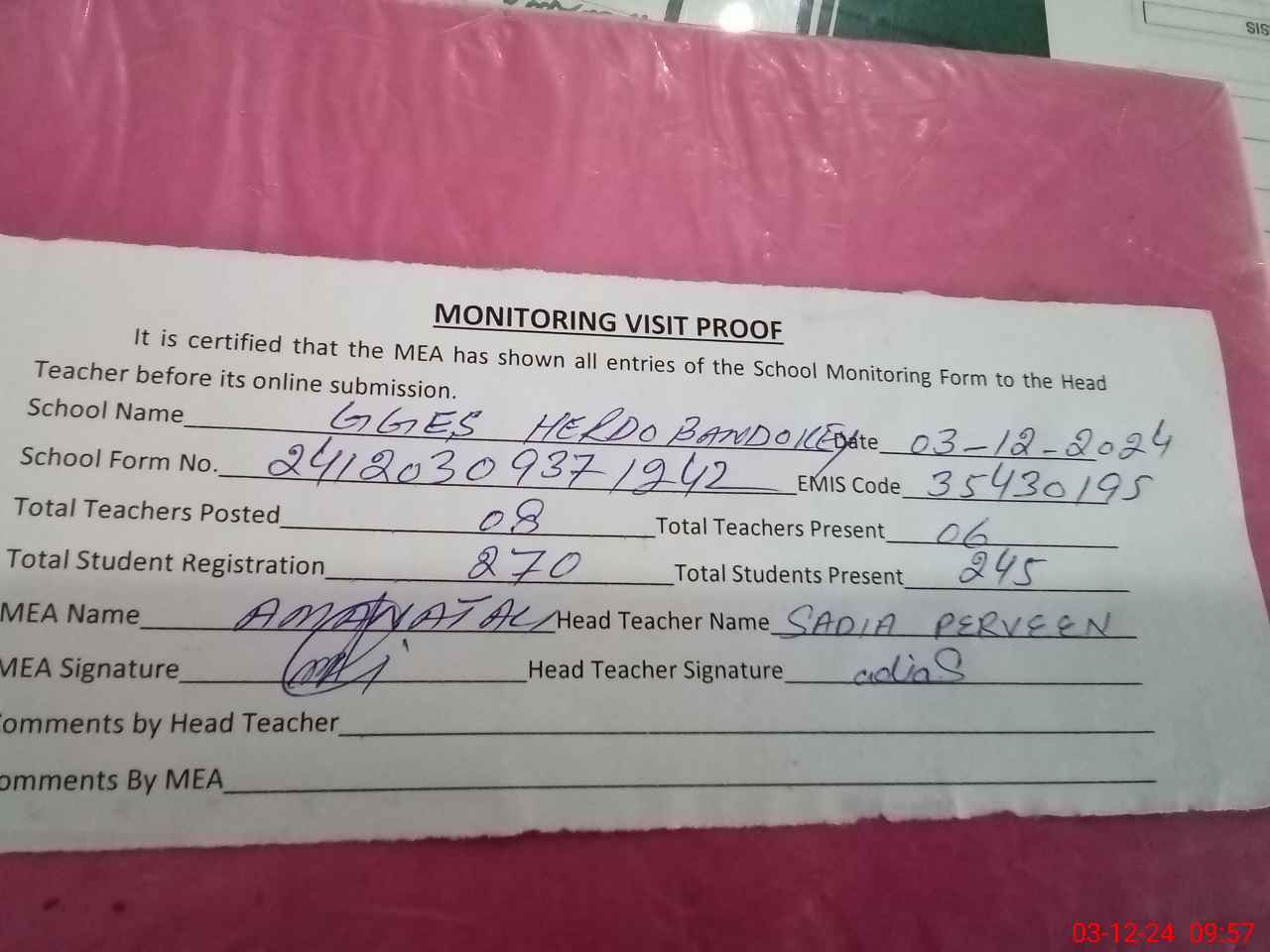 | Attendance Register | Head Teacher | MEA with School | Visit Proof |