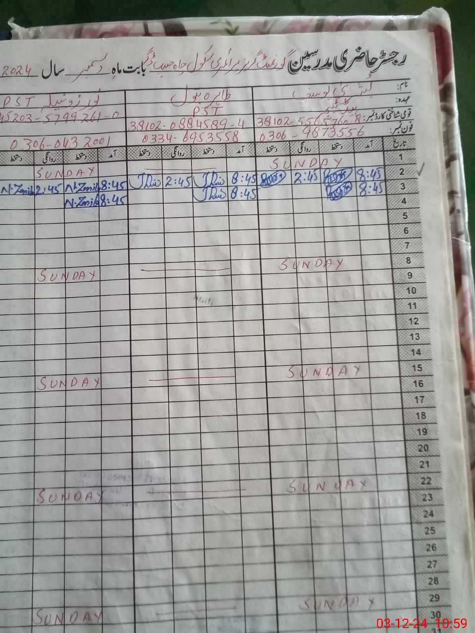 | CNIC | Full Name | Designation | R/C | Absence During Last Calender Month |
