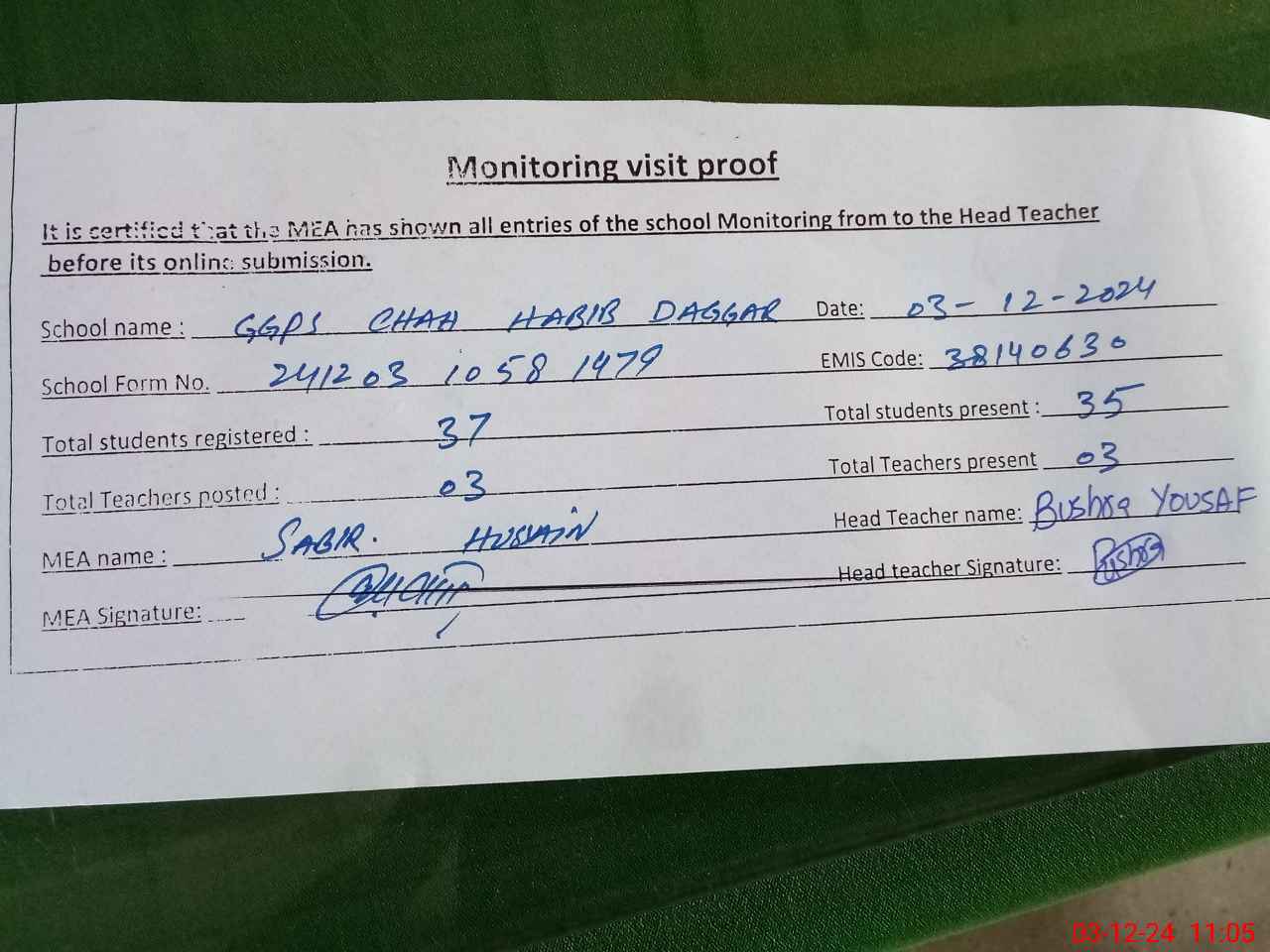 | Attendance Register | Head Teacher | MEA with School | Visit Proof |