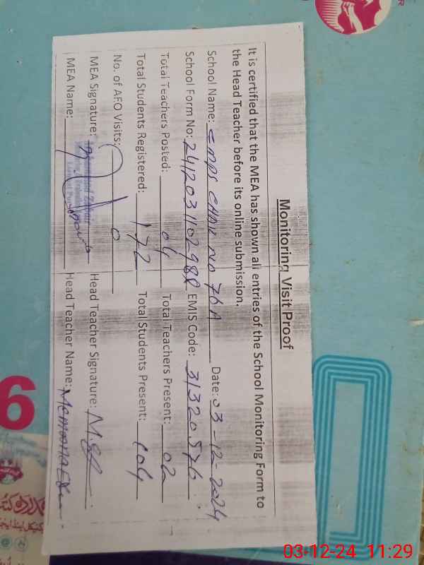 | Name: MA**** AB**** Designation: (School Headmaster's/Headmistress's) PST/PTC/JV Phone/Cell Number: 03**** |
