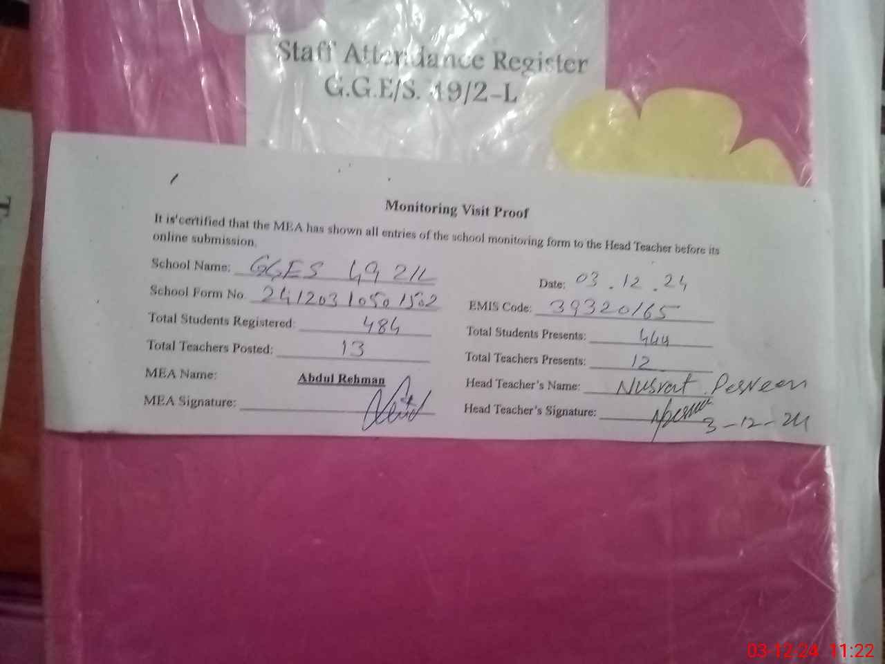 | Attendance Register | Head Teacher | MEA with School | Visit Proof |