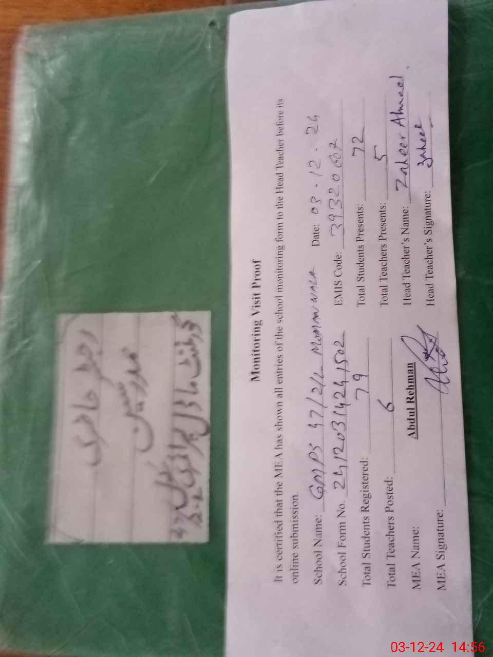 | Attendance Register | Head Teacher | MEA with School | Visit Proof |