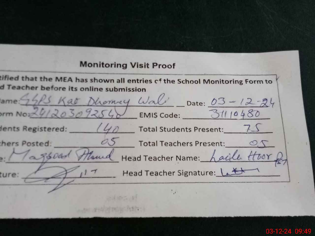 | Attendance Register | Head Teacher | MEA with School | Visit Proof |