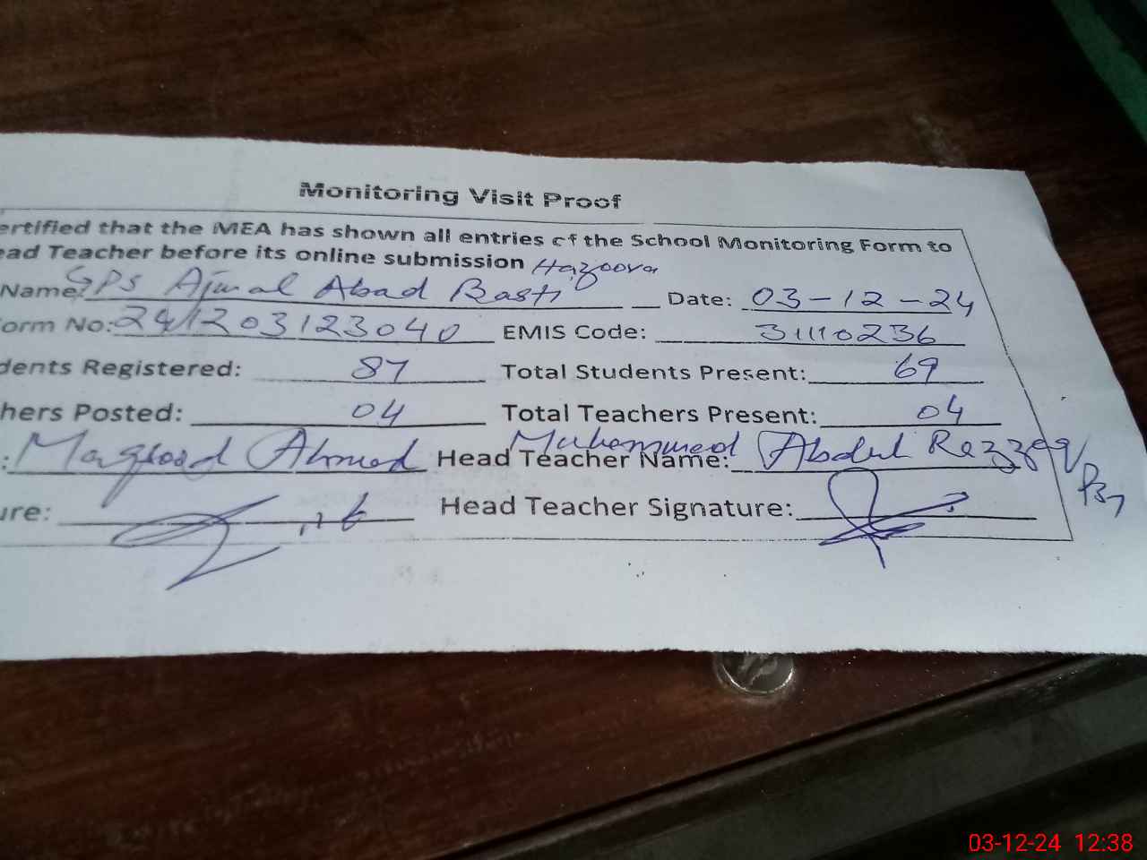 | EMIS Code: 31110236 | Name of School: GPS AJMAL ABAD (BASTI HAZOORA) | |||