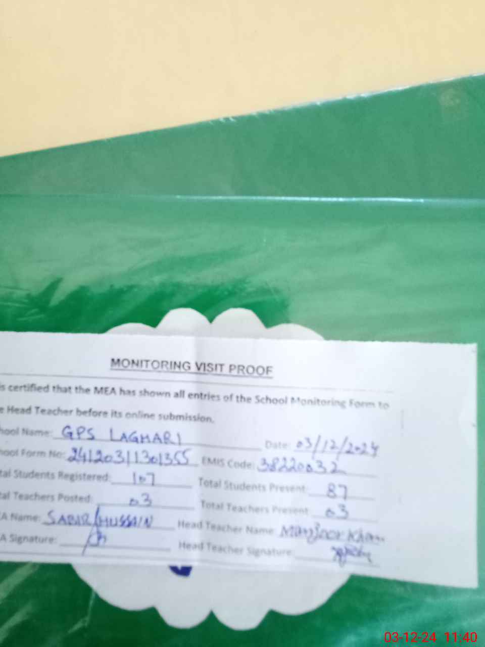 | Attendance Register | Head Teacher | MEA with School | Visit Proof |