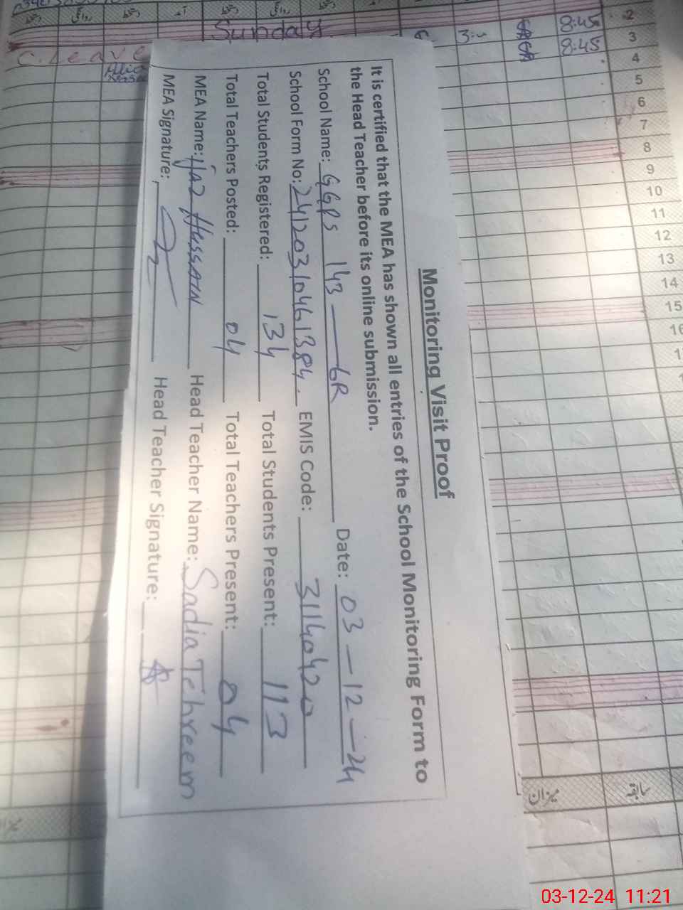 | Attendance Register | Head Teacher | MEA with School | Visit Proof |