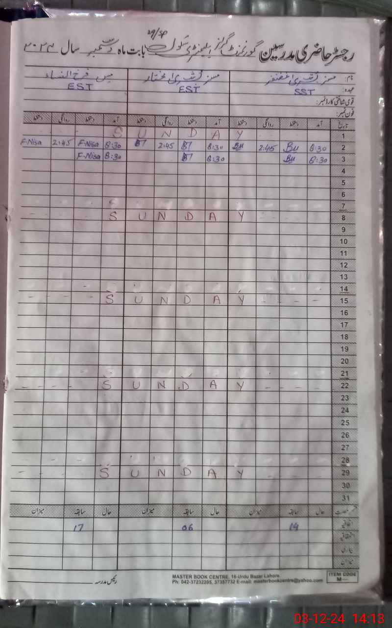 | CNIC | Full Name | Designation | R/C | Absence During Last Calender Month |