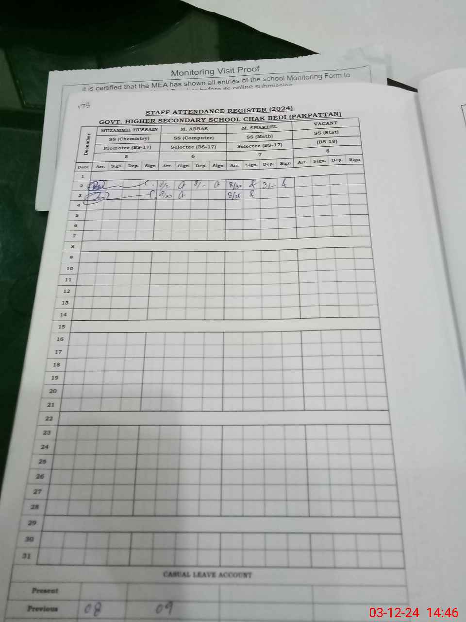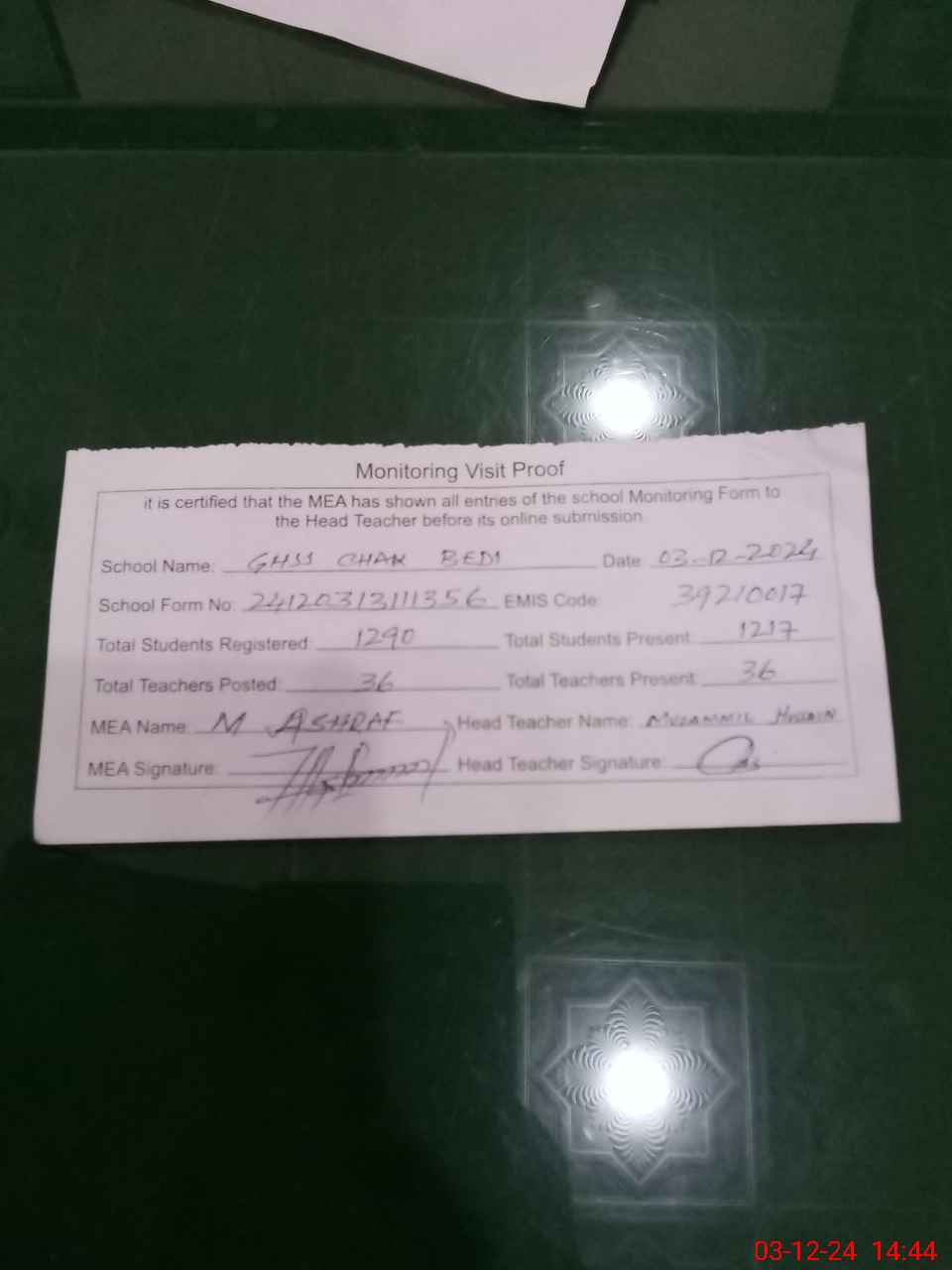 | Attendance Register | Head Teacher | MEA with School | Visit Proof |