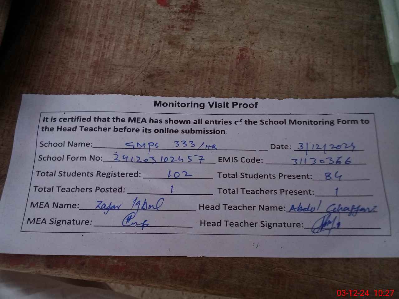 | Attendance Register | Head Teacher | MEA with School | Visit Proof |