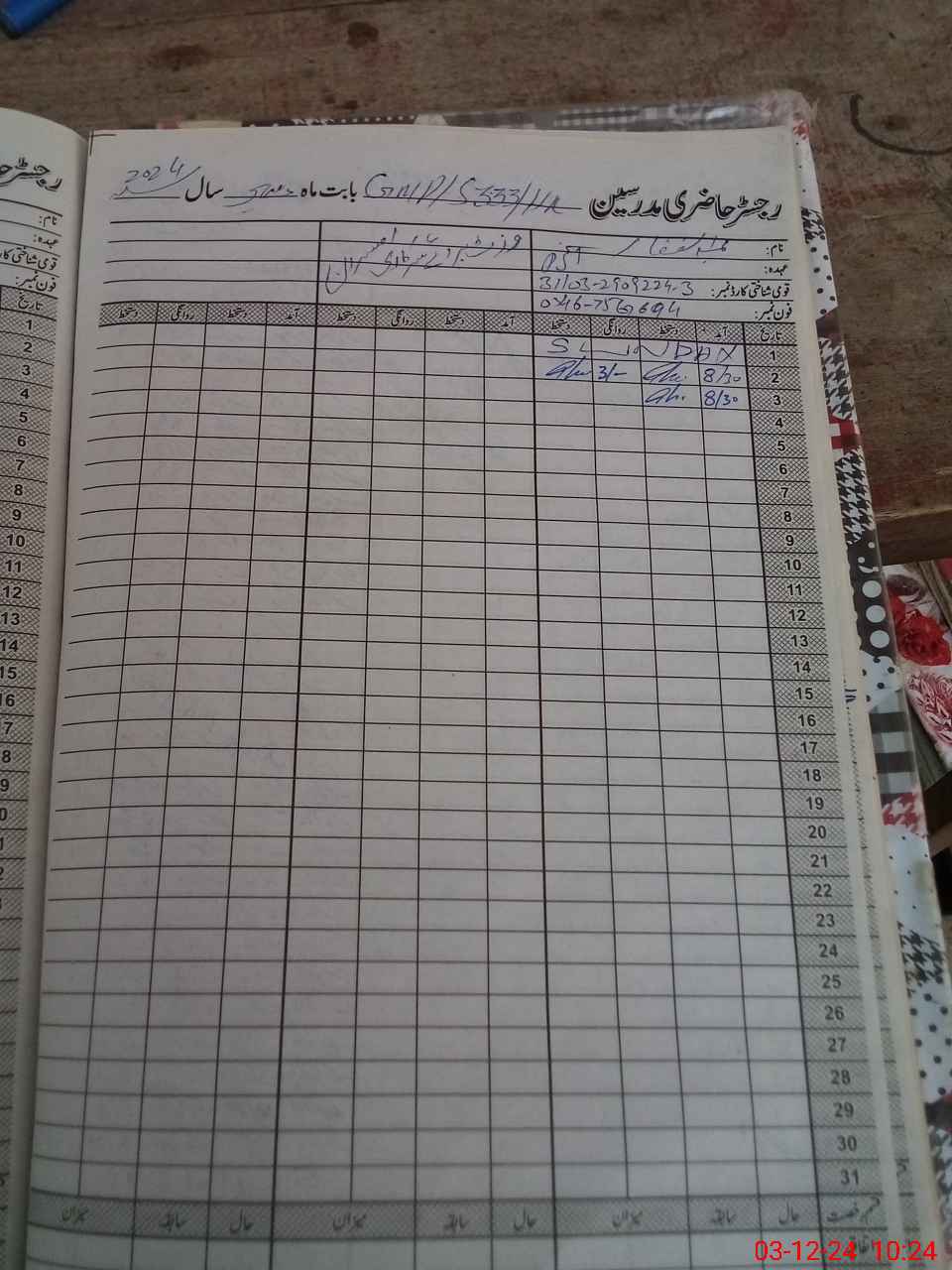 | CNIC | Full Name | Designation | R/C | Absence During Last Calender Month |