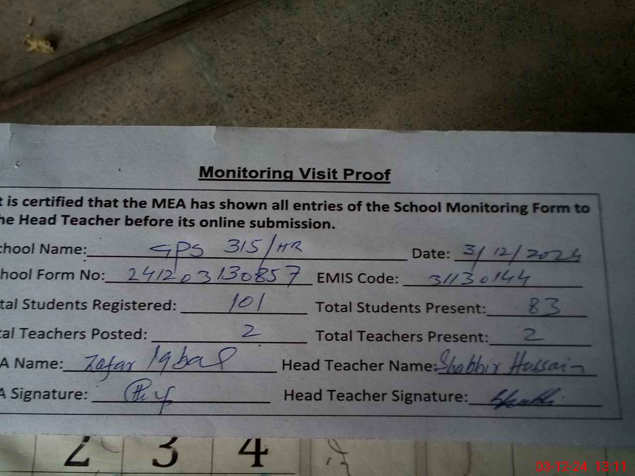 | EMIS Code: 31130144 | Name of School: GPS CHAK 315/HR | |||
