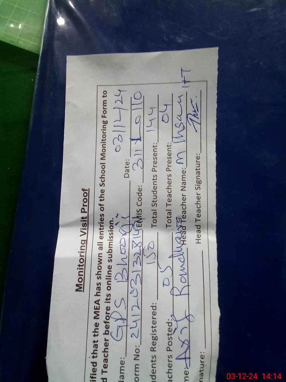 | Attendance Register | Head Teacher | MEA with School | Visit Proof |