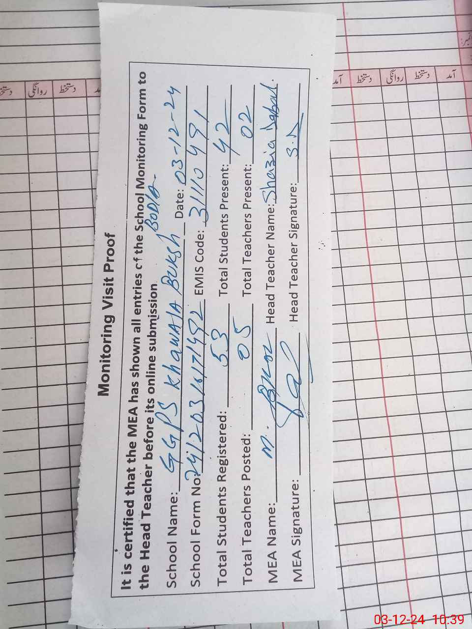 | Attendance Register | Head Teacher | MEA with School | Visit Proof |