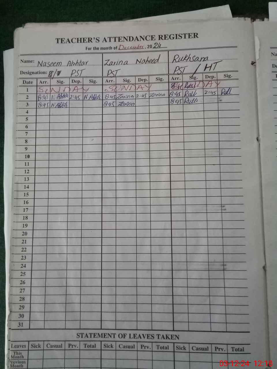 | CNIC | Full Name | Designation | R/C | Absence During Last Calender Month |