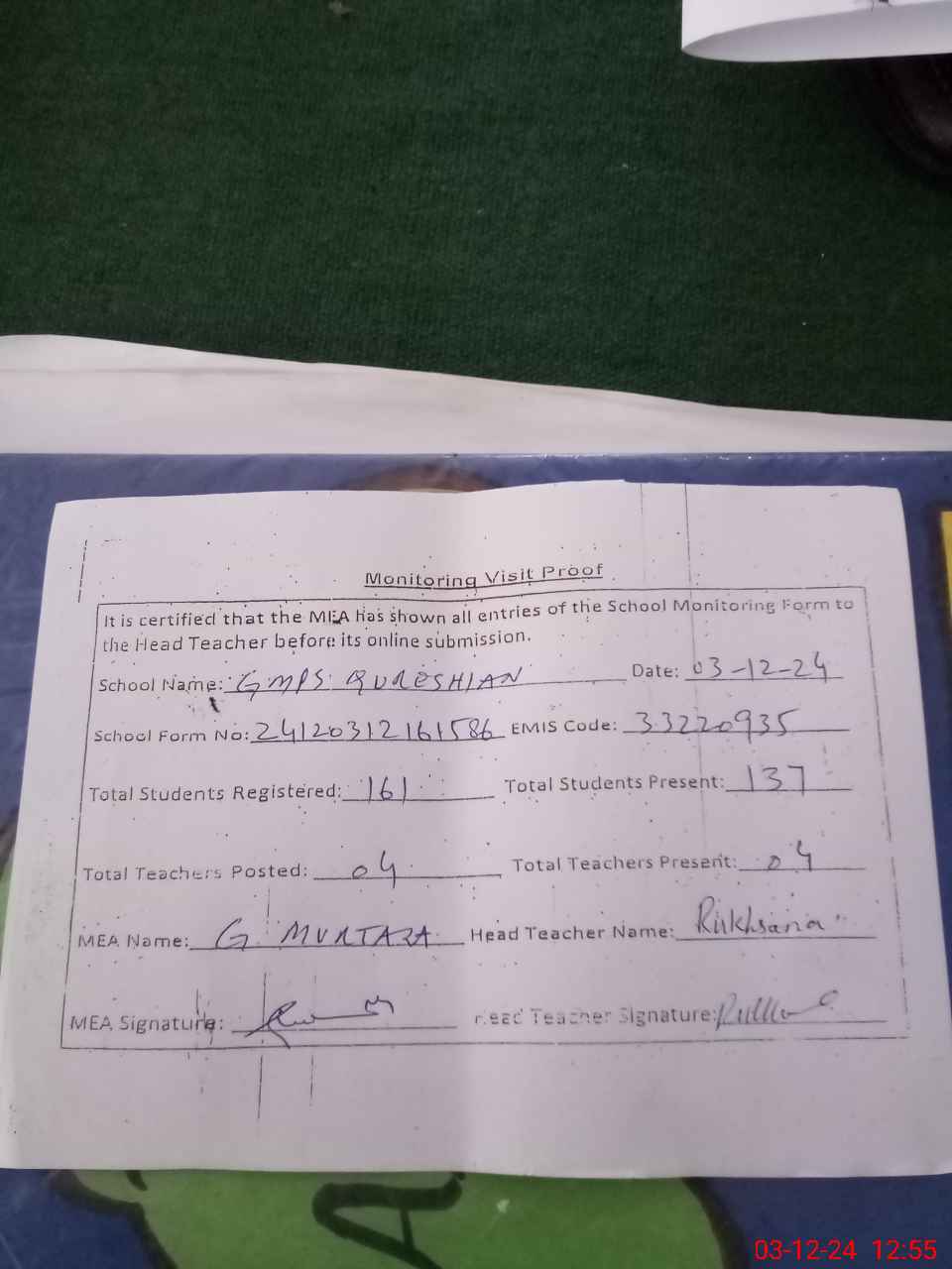 | Attendance Register | Head Teacher | MEA with School | Visit Proof |