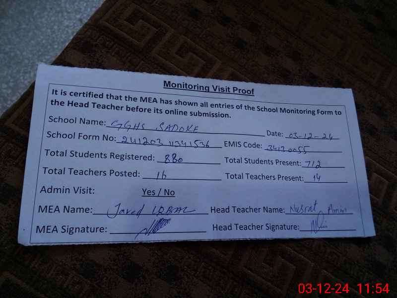 | Certified that this School was Inspected by the Undersigned MEA/DMO Today and the Information Stated Above is as Per Record. | |||||