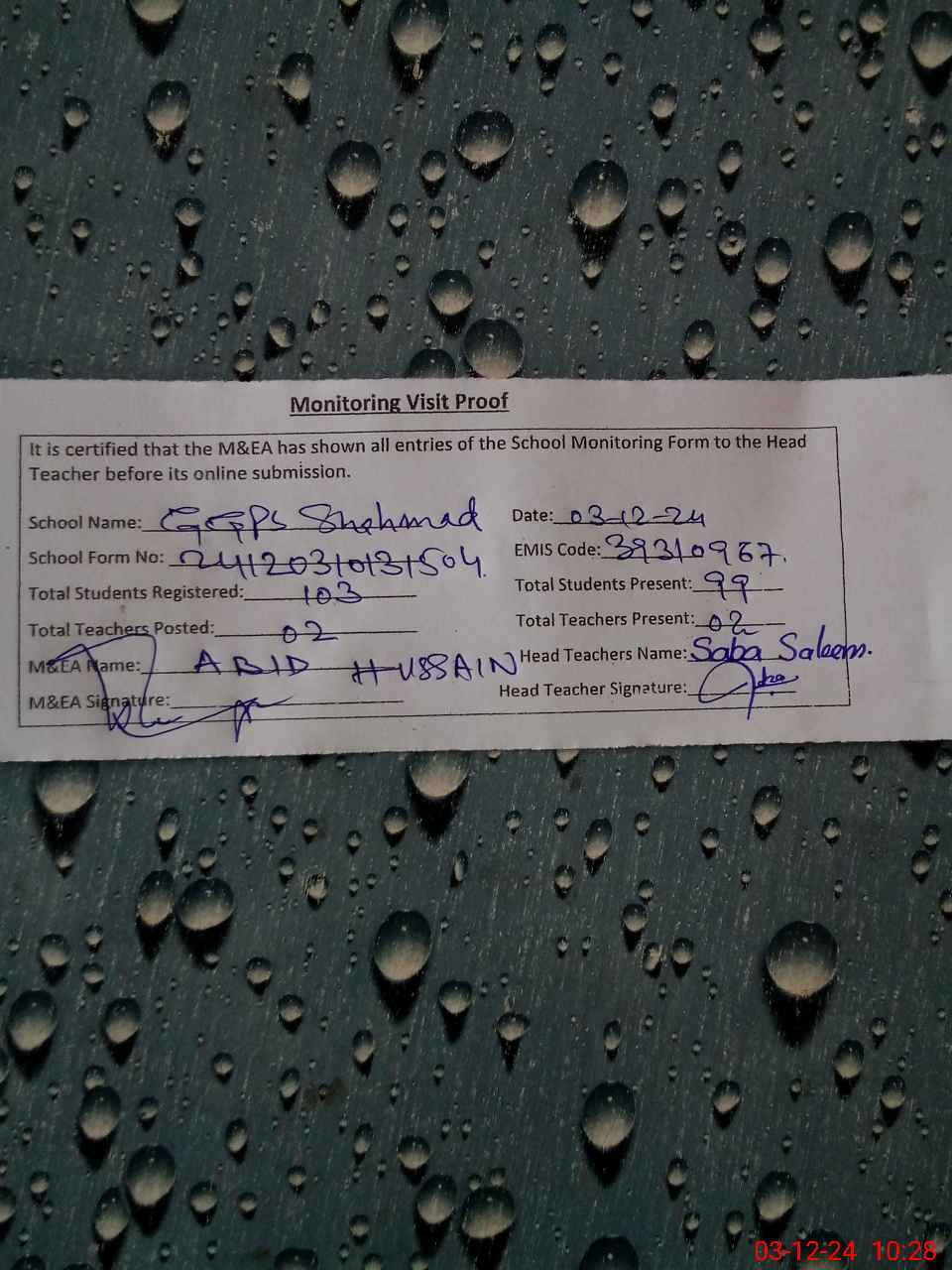 | Attendance Register | Head Teacher | MEA with School | Visit Proof |