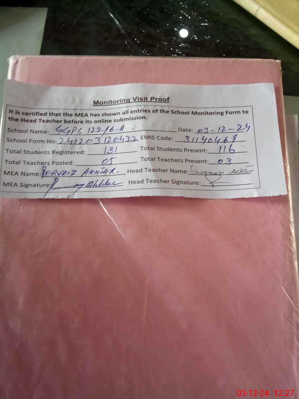 | Attendance Register | Head Teacher | MEA with School | Visit Proof |