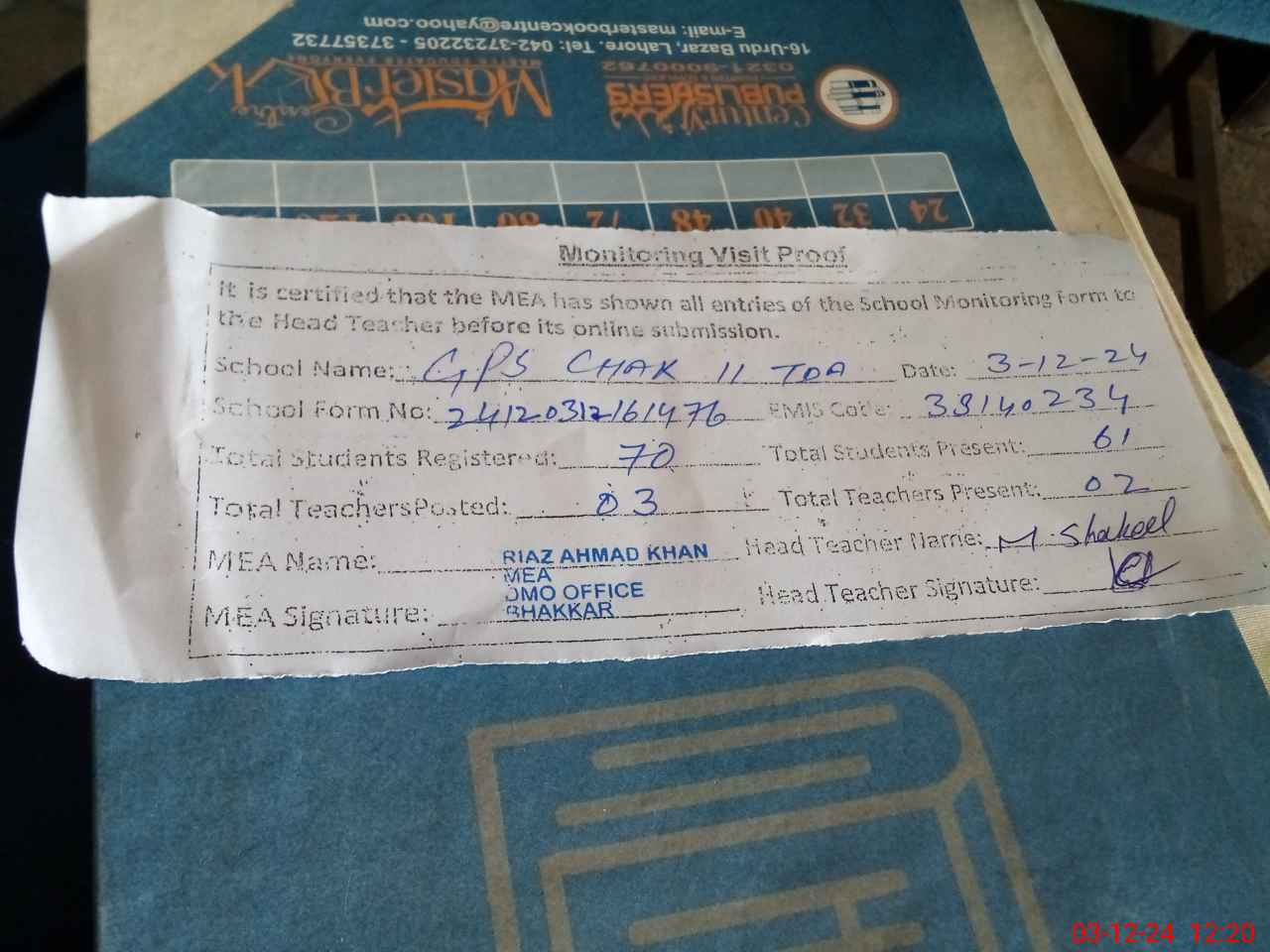| Attendance Register | Head Teacher | MEA with School | Visit Proof |