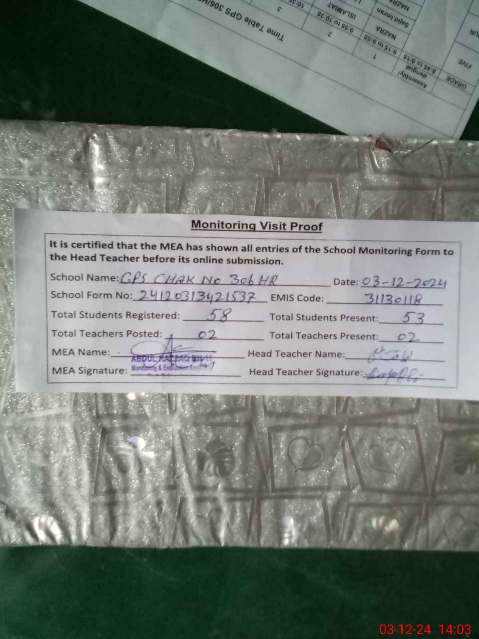 | EMIS Code: 31130118 | Name of School: GPS CHAK 306/HR | |||