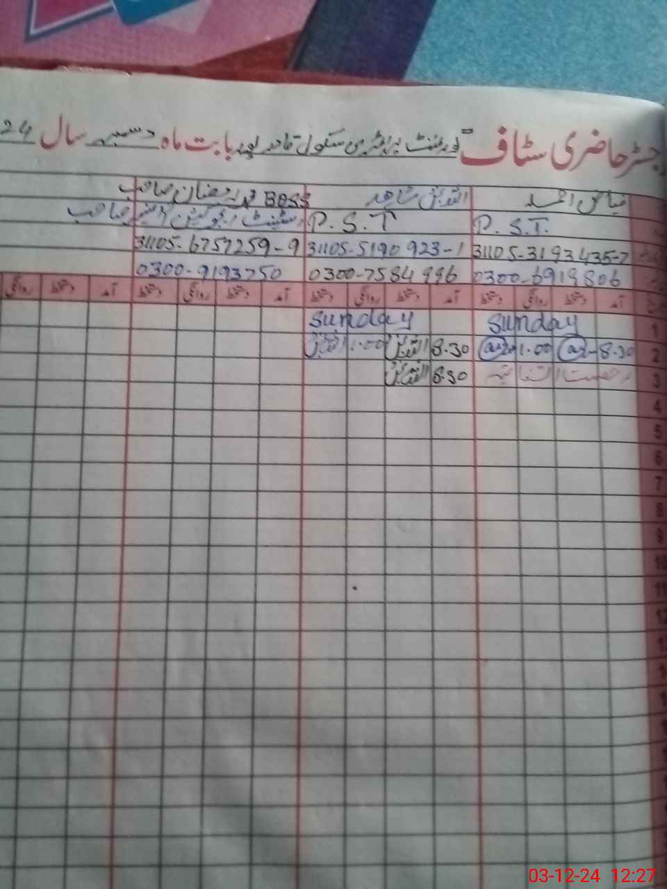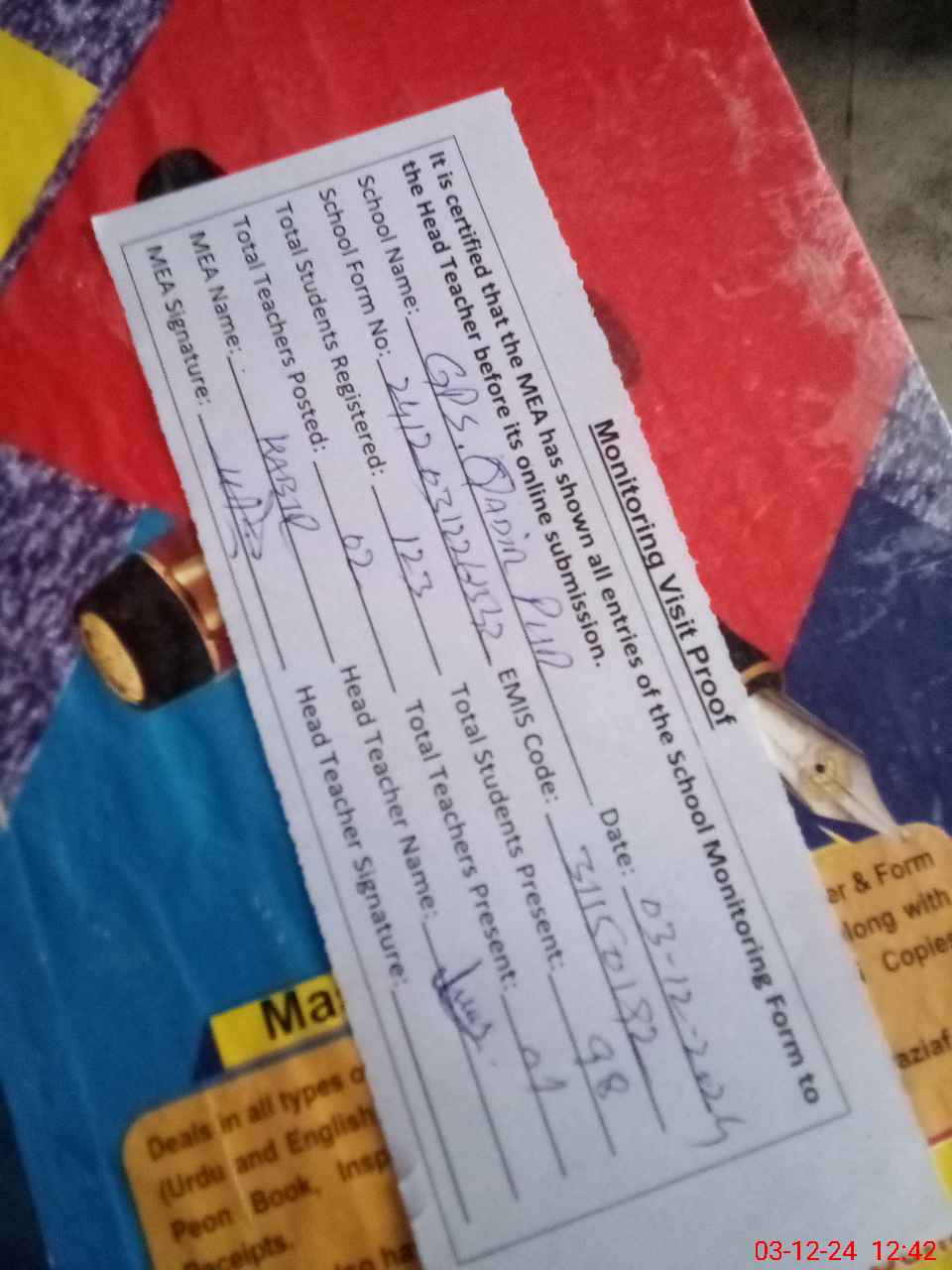 | Remarks (Use Separate Page if Required): Insaf after noon NO attendance of students on attendance register and also 02 teachers found absent on 01?12?2024 NSB fund record not available | |||||