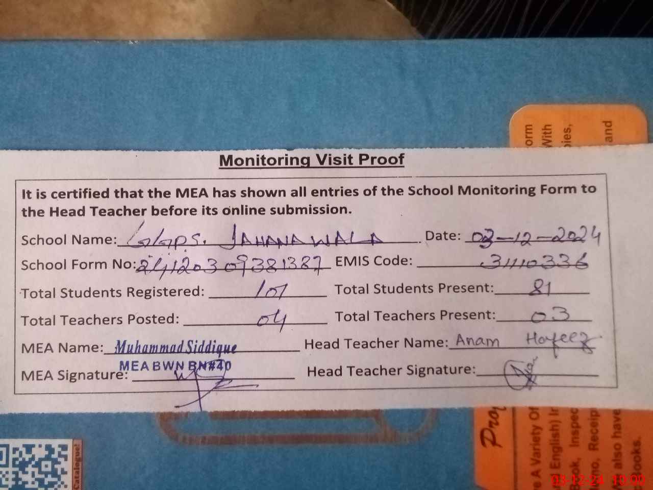 | Attendance Register | Head Teacher | MEA with School | Visit Proof |