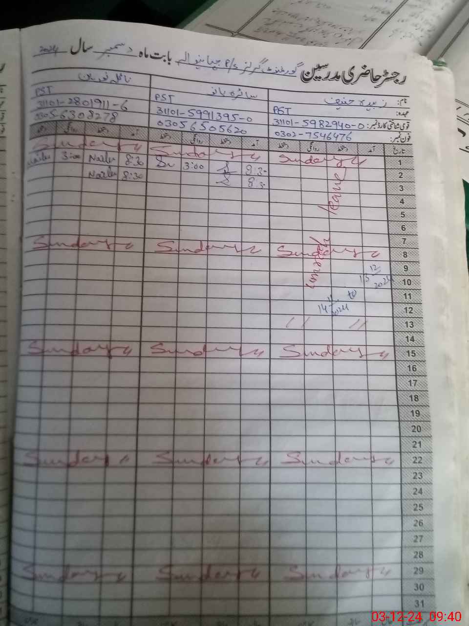 | CNIC | Full Name | Designation | R/C | Absence During Last Calender Month |