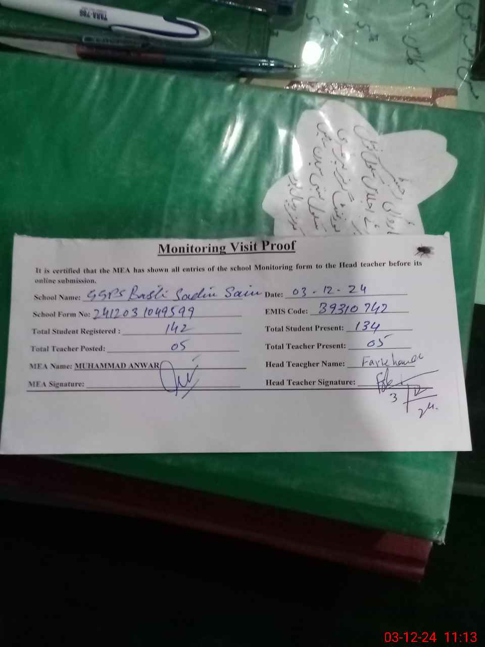 | Attendance Register | Head Teacher | MEA with School | Visit Proof |