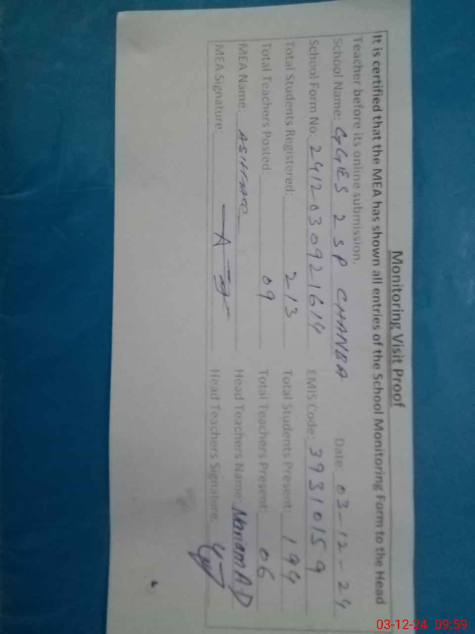 | Attendance Register | Head Teacher | MEA with School | Visit Proof |
