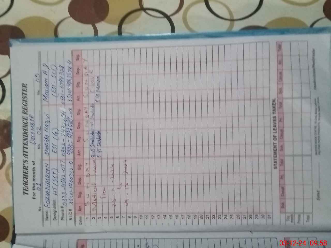 | CNIC | Full Name | Designation | R/C | Absence During Last Calender Month |