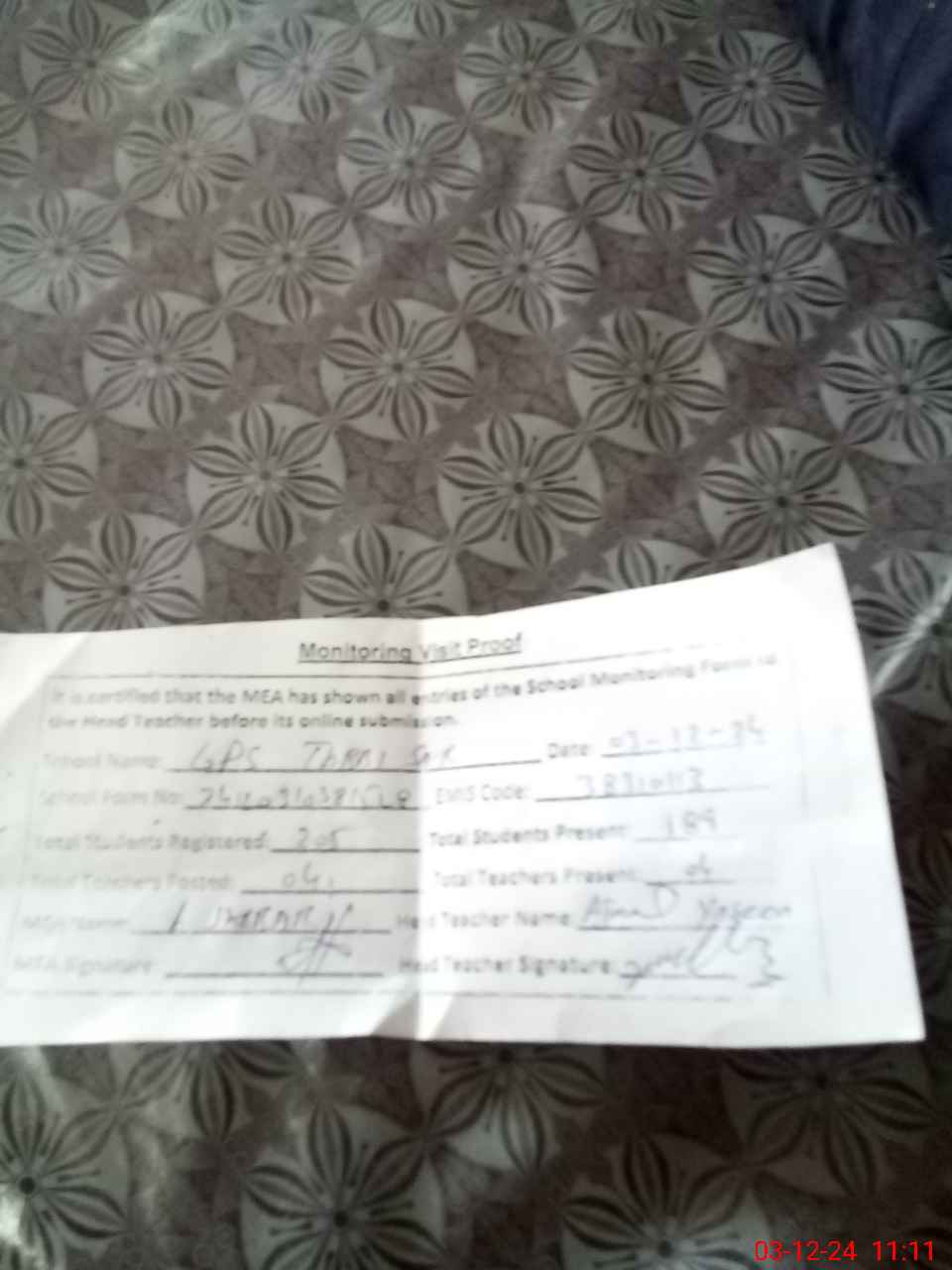 | Attendance Register | Head Teacher | MEA with School | Visit Proof |