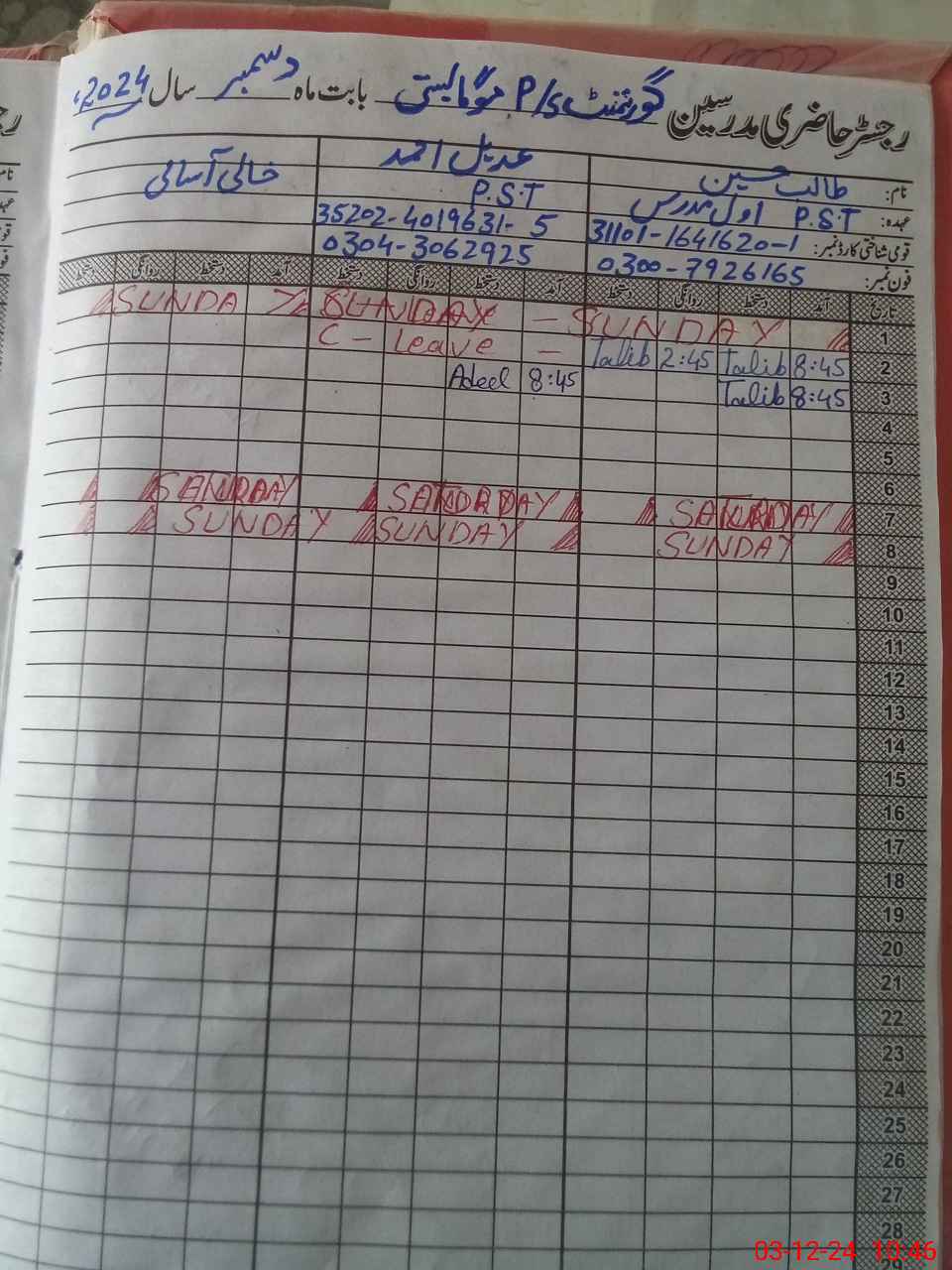 | CNIC | Full Name | Designation | R/C | Absence During Last Calender Month |