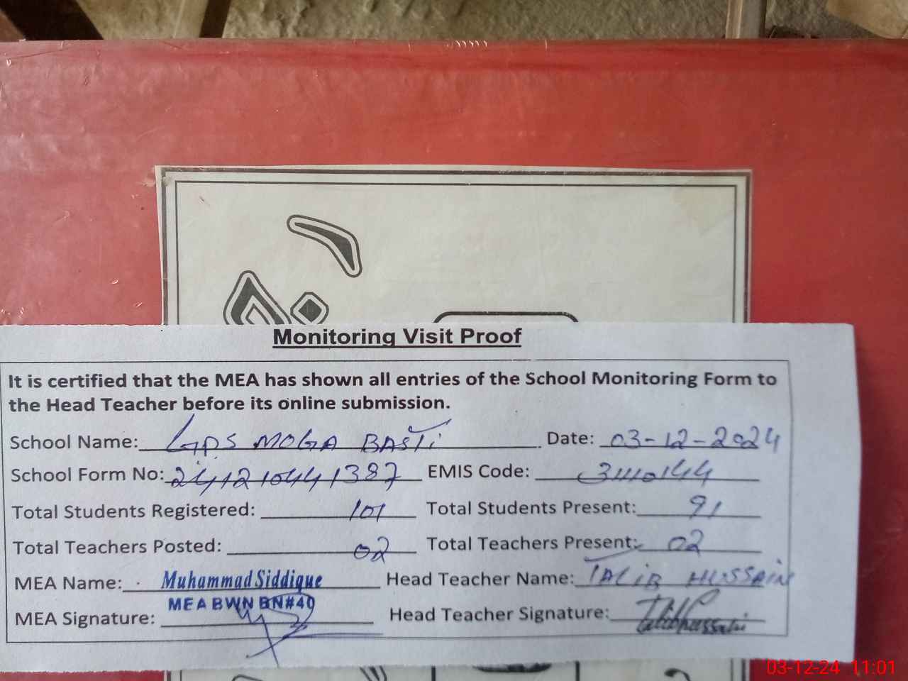 | Attendance Register | Head Teacher | MEA with School | Visit Proof |