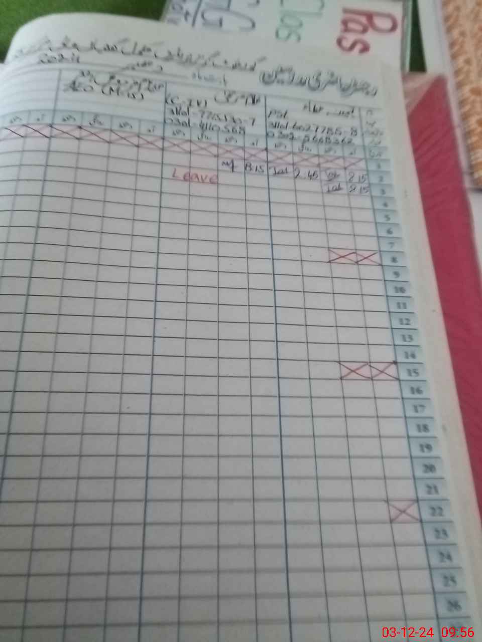| CNIC | Full Name | Designation | R/C | Absence during last cal. month |
