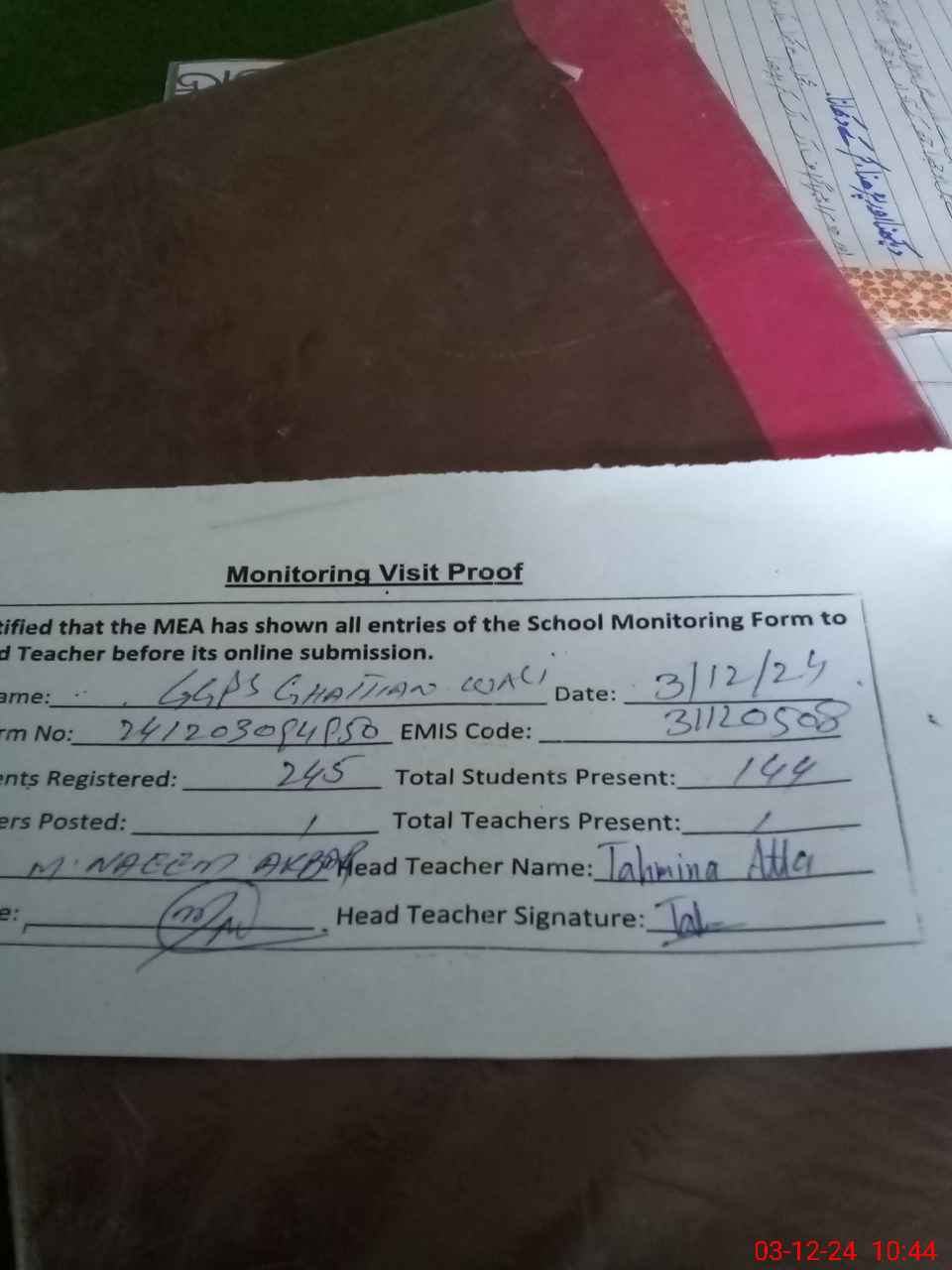 | Attendance Register | Head Teacher | MEA with School | Visit Proof |
