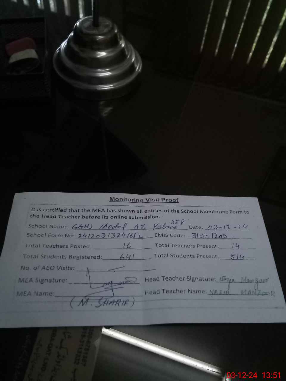 | Certified that this School was Inspected by the Undersigned MEA/DMO Today and the Information Stated Above is as Per Record. | |||||