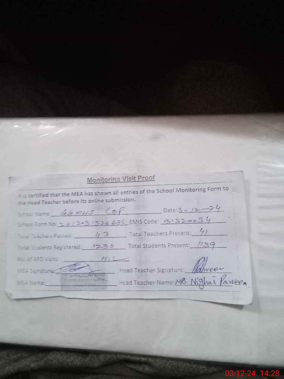 | Attendance Register | Head Teacher | MEA with School | Visit Proof |