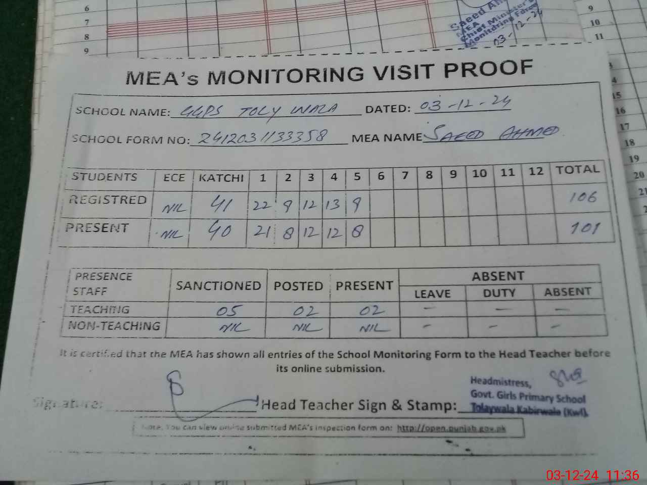 | EMIS Code: 36410341 | Name of School: GGPS TOLAY WALA, P/O KOHI WALA, KABIRWALA | |||