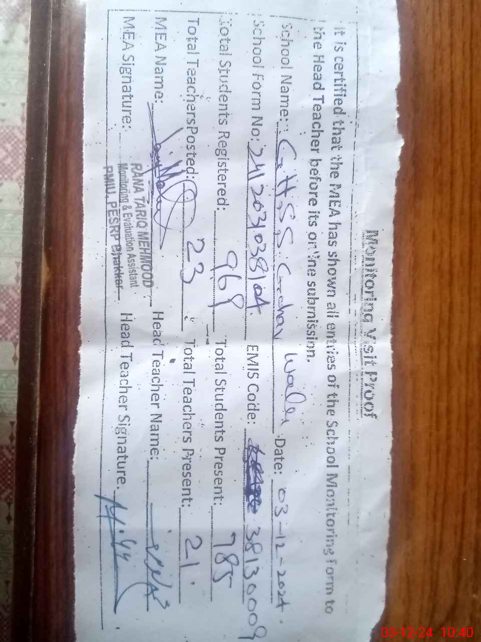 | Attendance Register | Head Teacher | MEA with School | Visit Proof |