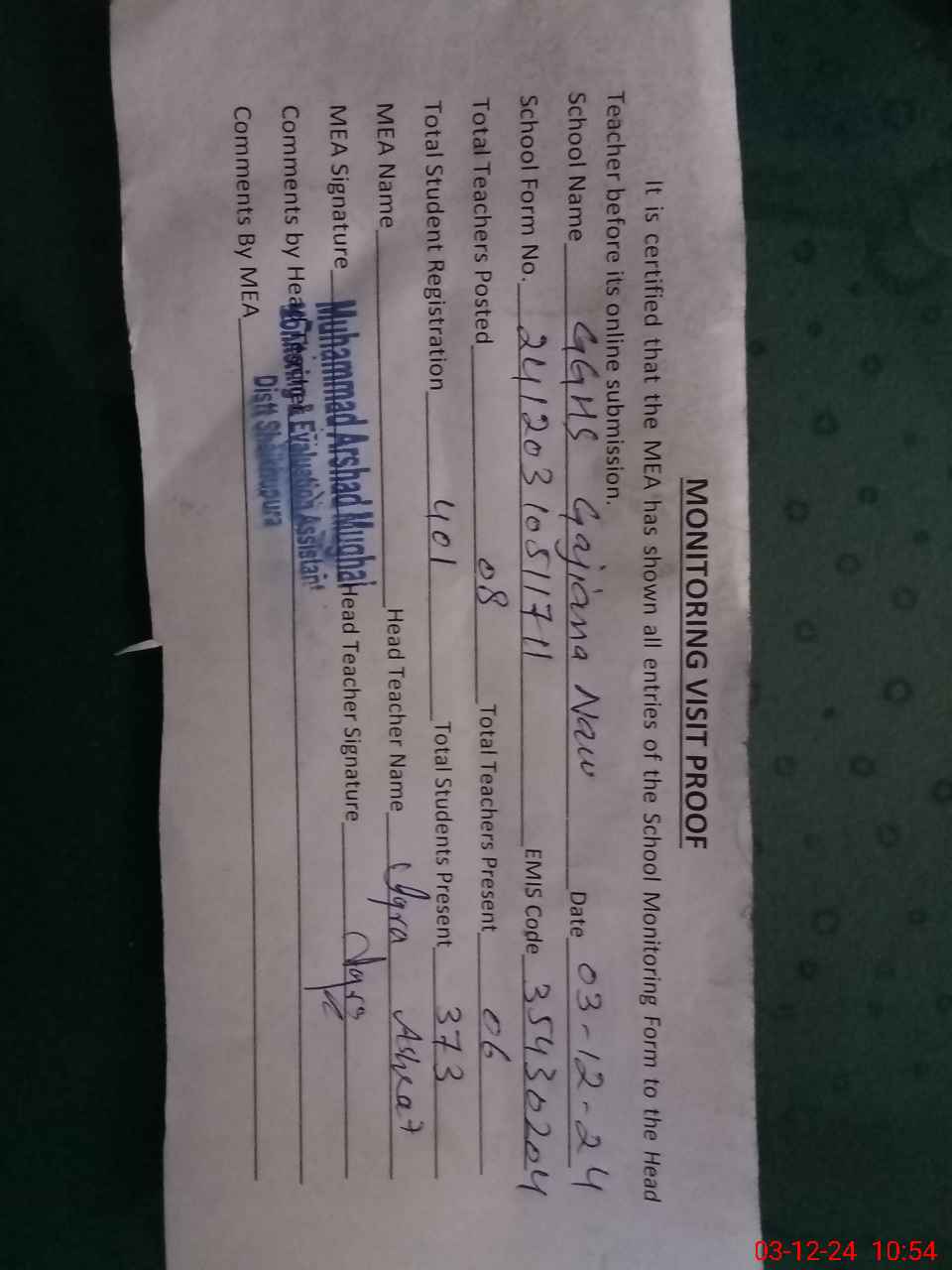 | Attendance Register | Head Teacher | MEA with School | Visit Proof |