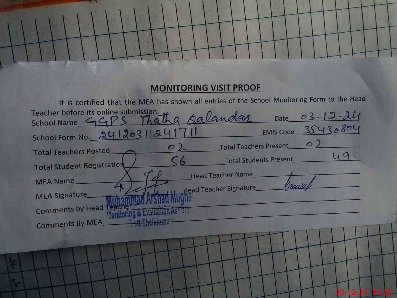 | Attendance Register | Head Teacher | MEA with School | Visit Proof |