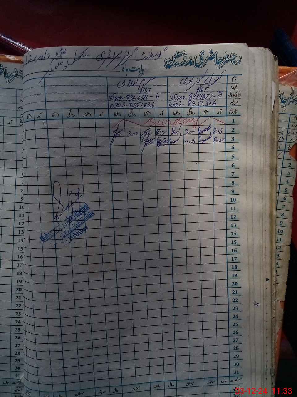| CNIC | Full Name | Designation | R/C | Absence During Last Calender Month |
