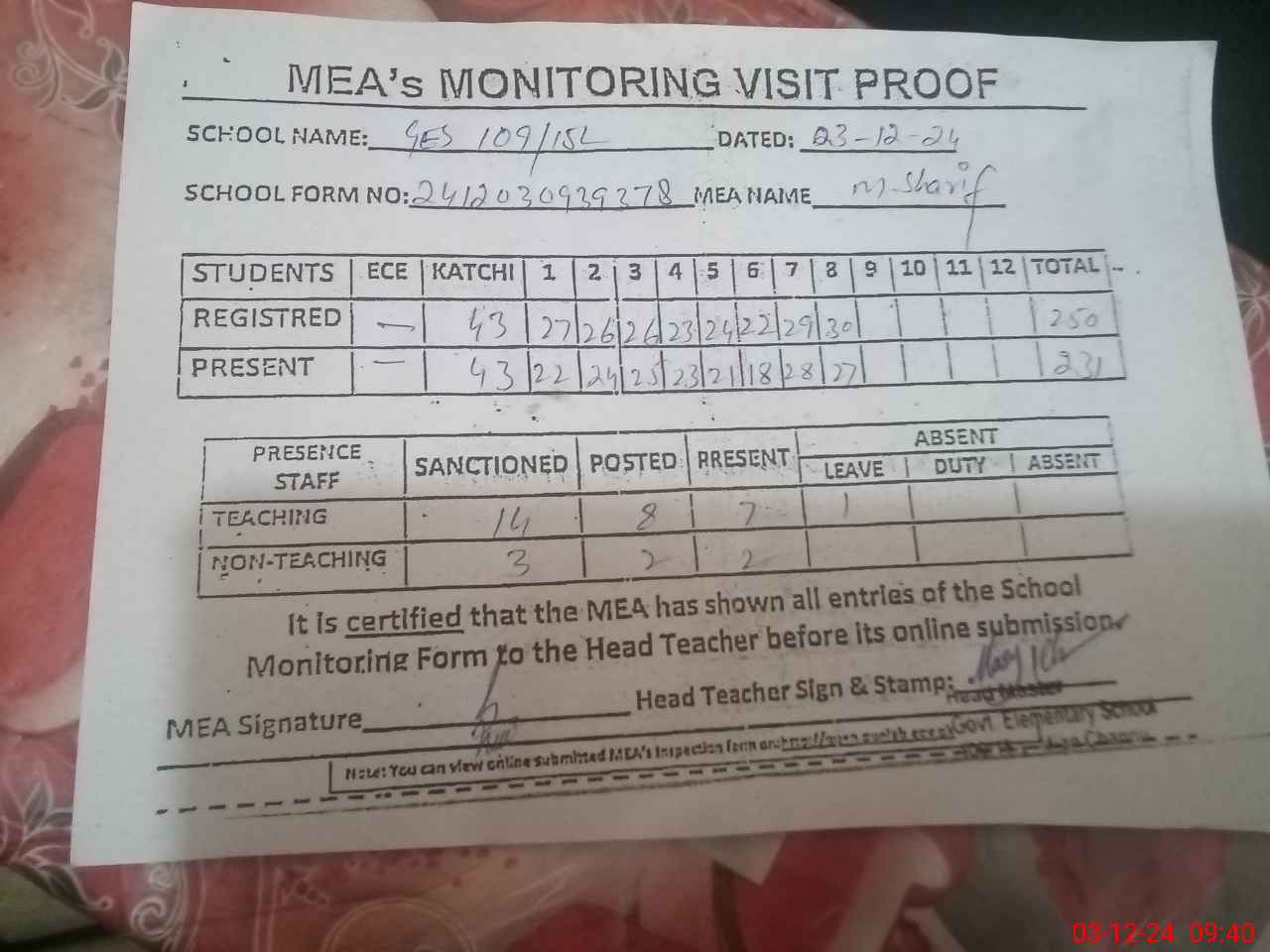 | Attendance Register | Head Teacher | MEA with School | Visit Proof |