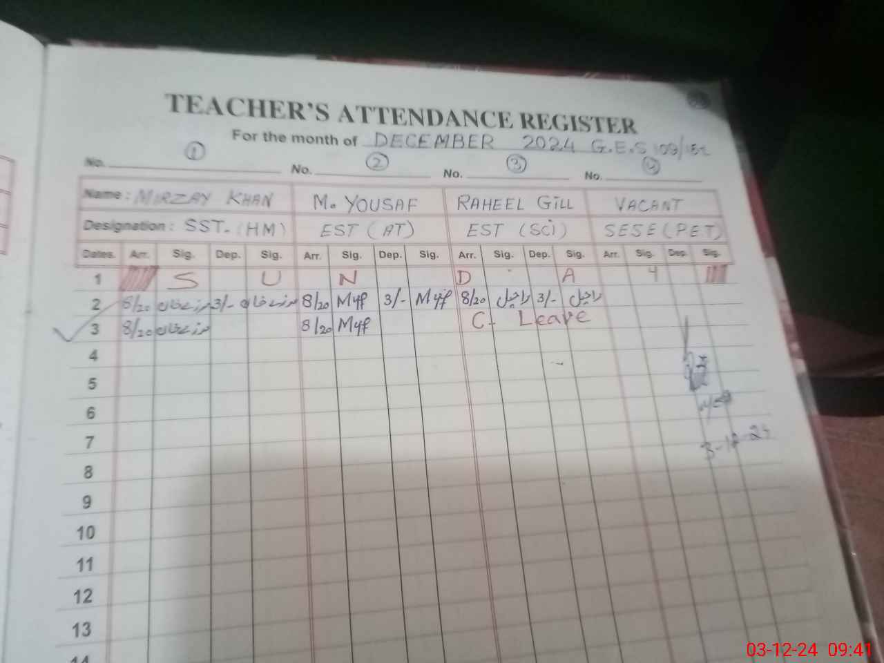 | CNIC | Full Name | Designation | R/C | Absence During Last Calender Month |